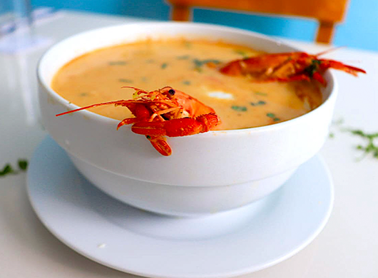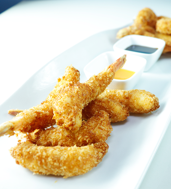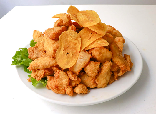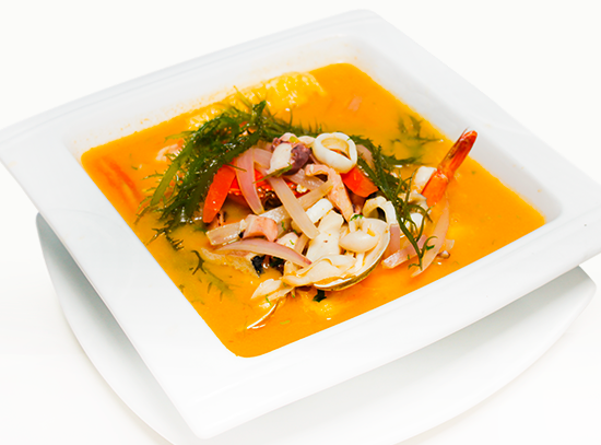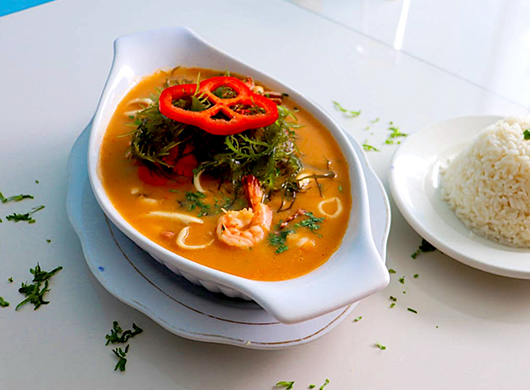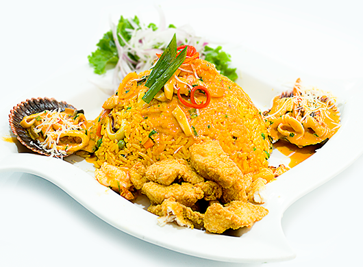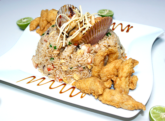 (Arroz con mariscos, chicharrón de pescado y picante de mariscos)