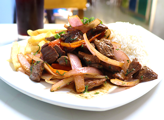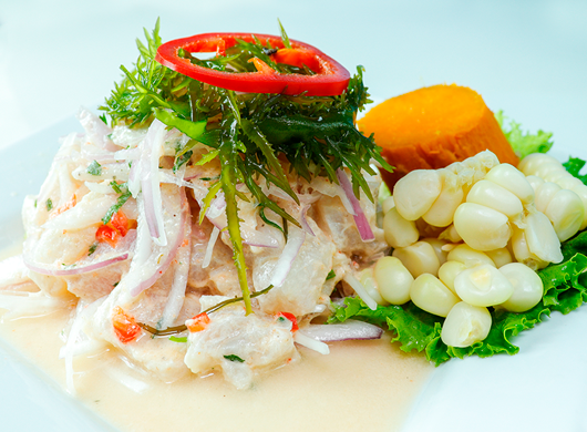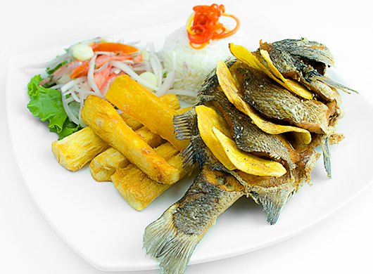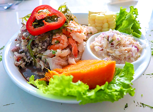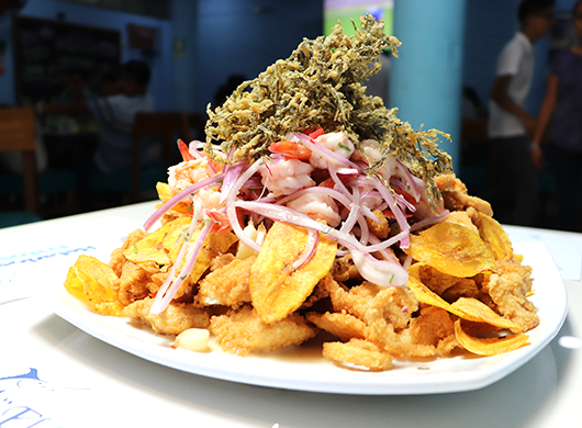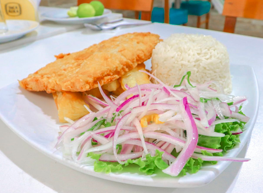 (Ceviche de pescado, arroz con mariscos, y chicharrón de pescado)