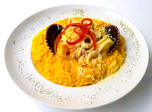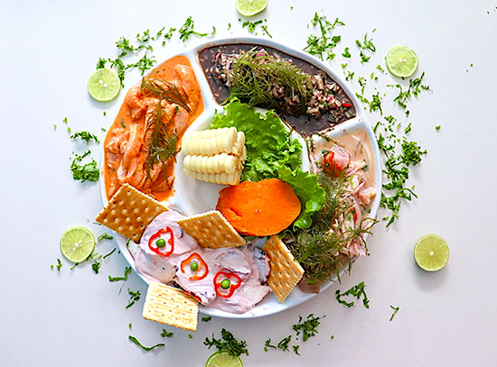 (Ceviche de pescado, tiradito al ají amarillo, jalea de pescado y arroz con mariscos)
